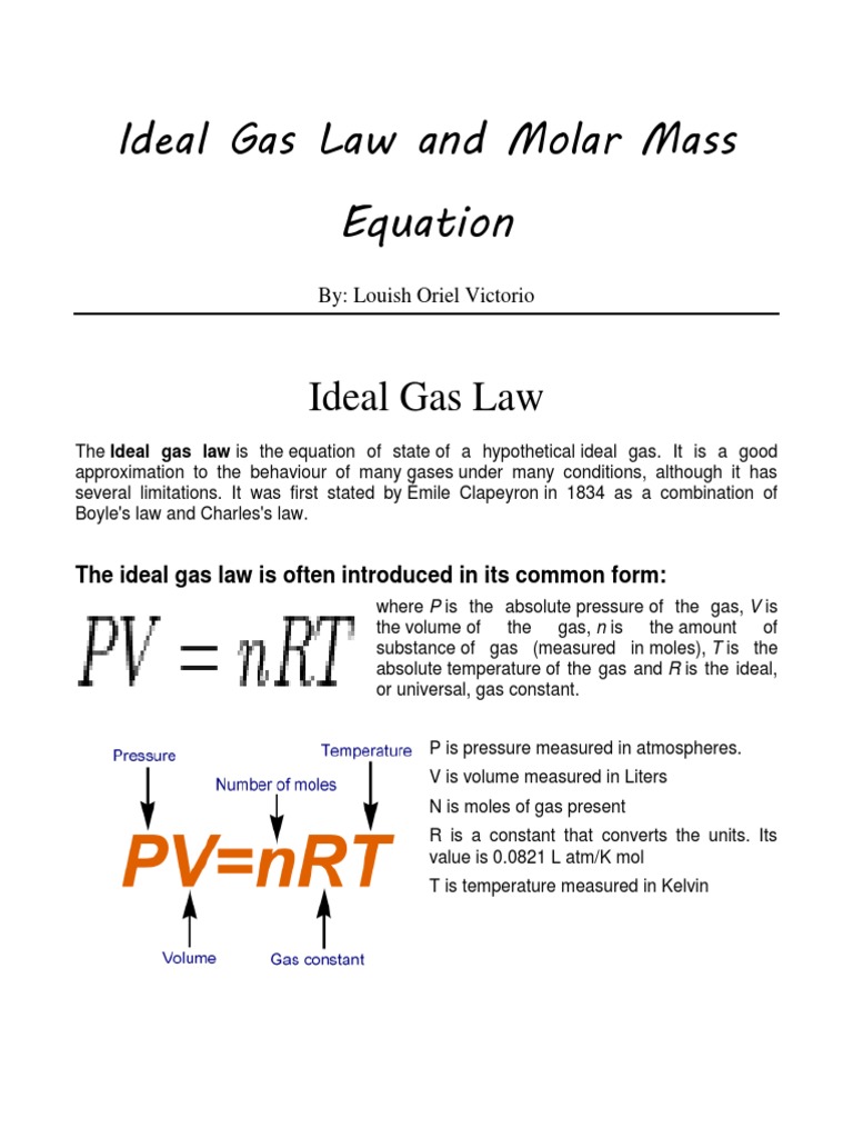 Ideal gas laws are used to find the species partial pressures and hence cathode exit pressure the ideal gas laws work well at relatively low pressures and relatively high temperatures. The ideal gas law, also called the general gas equation, is the equation of state of a hypothetical ideal gas. The volume of a given gas sample is directly proportional to its absolute temperature at constant pressure (charles's law). At high temperatures and low pressures, gases behave close to ideally. The value and units of r depend on the units used in determining p, v. The three historically important gas laws derived relationships between two physical properties of a rearranging to a more familiar form: It's very simple, easy to use, and easy to understand. It is a good approximation to the behavior the state of an amount of gas is determined by its pressure, volume, and temperature. Say out loud liter atmospheres per mole kelvin. this is not the only value of r that can exist. The ideal gas law can be viewed as arising from the kinetic pressure of gas molecules colliding with the walls of a container in accordance with newton's laws. Due to this fact the ideal gas law will only give an approximate value for real gases under normal condition that are not currently approaching qualification. The ideal gas law describes the property of a hypothetical ideal gas. But there is also a statistical element in the determination of the average kinetic energy of those molecules.